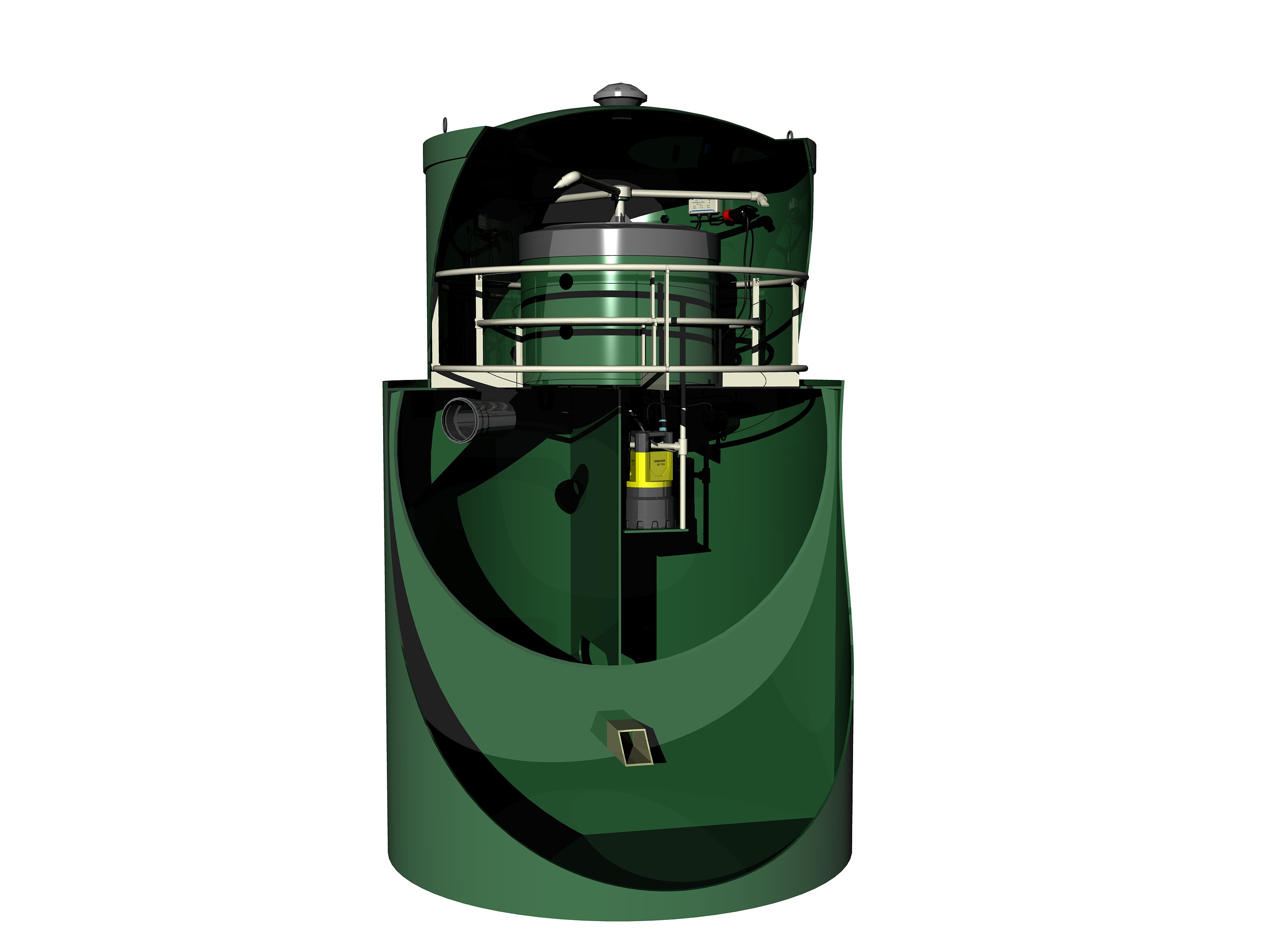 Цилиндрический корпус устанавливается в колодец из бетонных колец. Очищенная вода удаляется в самотечном режиме. Такая модель станции может монтироваться в условиях повышенной нагрузки (под автомобильные стоянки или на проезжей части)